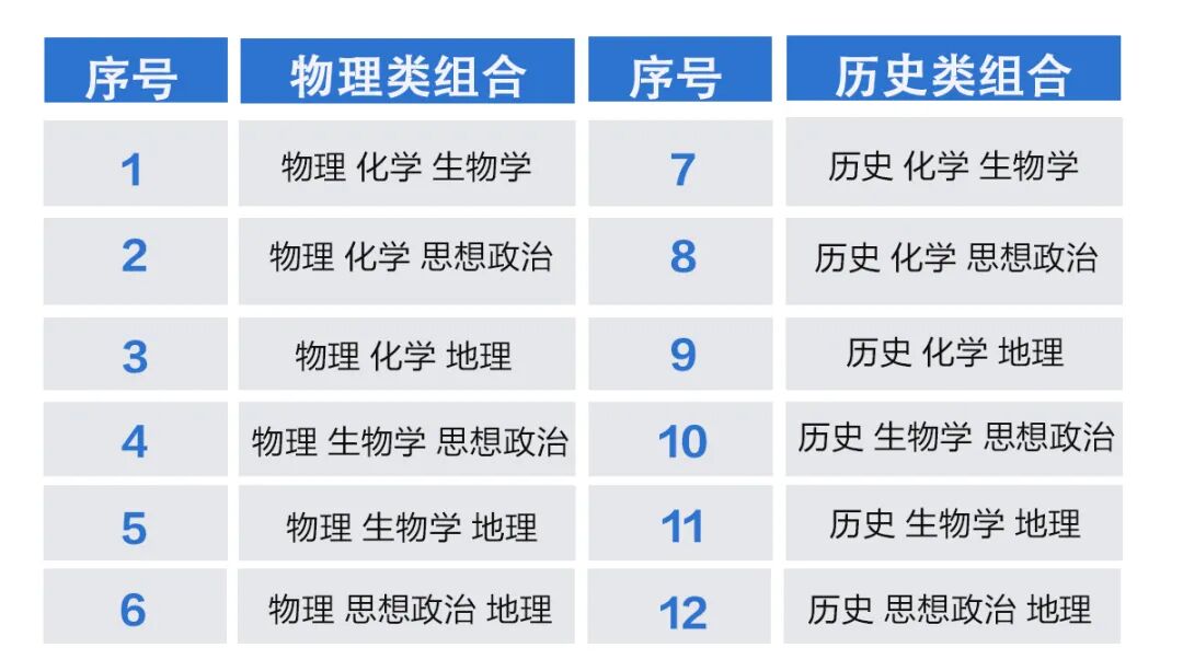 选择性考试科目理论上有12种组合,具体如下 ↓↓